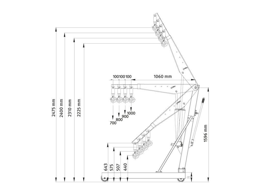 - Nosnosť podľa vyloženia ramena - 0,7 t / 0,8 t / 0,9 t / 1 t