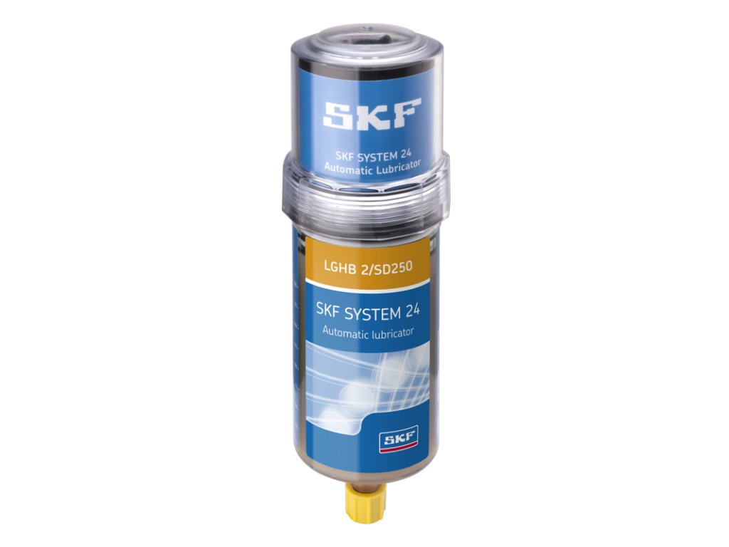 Elektromechanická jednobodová automatická maznica SKF SYSTEM 24 je optimálnou voľbou pri požiadavkách na jednoduchú a spoľahlivú automatickú maznicu pre meniace sa teploty alebo vzdialenou montážou s ohľadom na podmienky aplikácie (vibrácie, obmedzený priestor alebo nebezpečné prostredie).