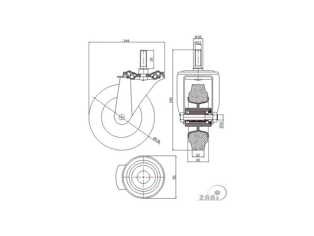 Plastový disk v kombinácii so šedým gumovým behúňom zabezpečuje nízku hmotnosť, tichý chod a šetrnosť k podlahám bez zanechávania stôp. Upínací čap s priemerom M12 umožňuje pevné a rýchle uchytenie kolesa.