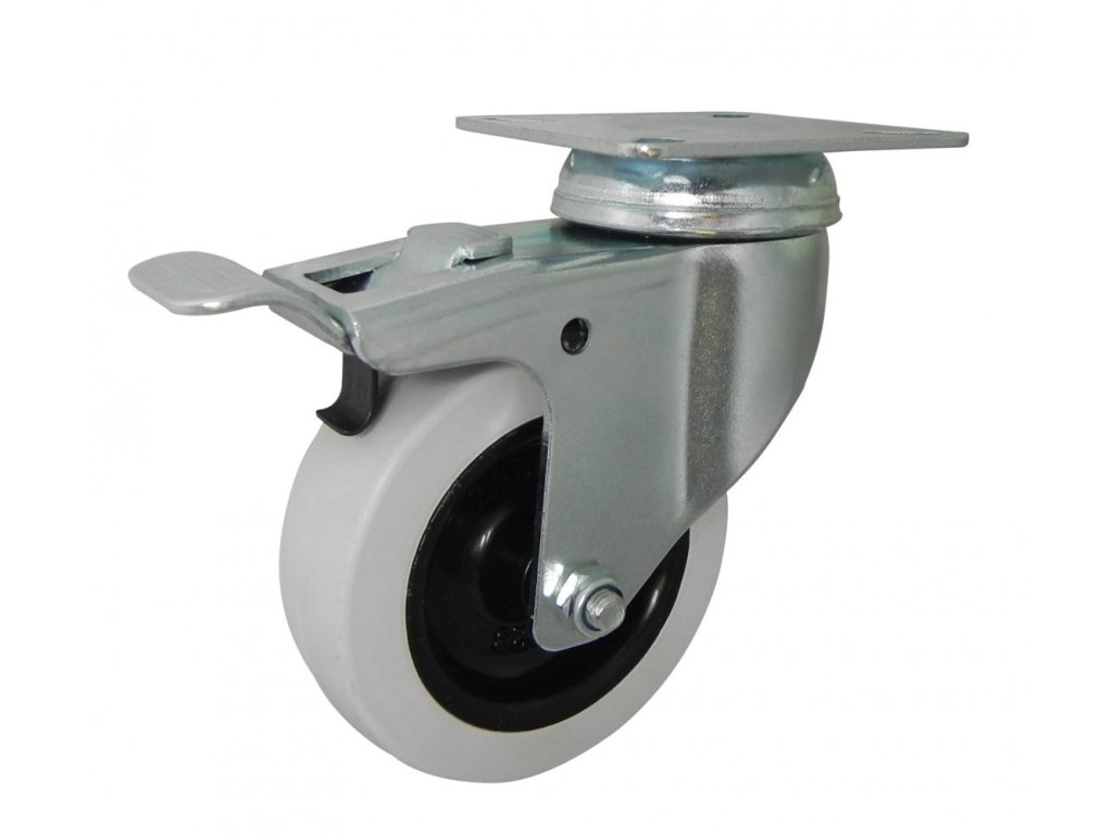Nábytkové koleso 75/23 mm, PA6/guma, otočná vidlica s doskou+brzda