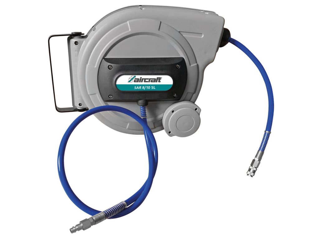 Navíjací bubon s polyuretánovou hadicou v dĺžke 10 m s rýchlospojkou a vsuvkou DN 7,4 as integrovanou brzdou regulujúcou rýchlosť navíjania hadice späť do bubna. Na montáž na stenu alebo strop.