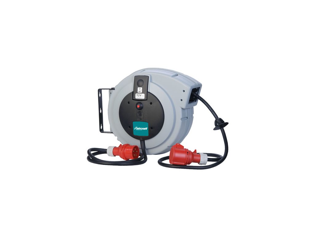 Automatický navíjací bubon s káblom pre dielenské aj priemyselné využitie. 400 V model s 5 × 16 A CEE zástrčkou a zásuvkou.