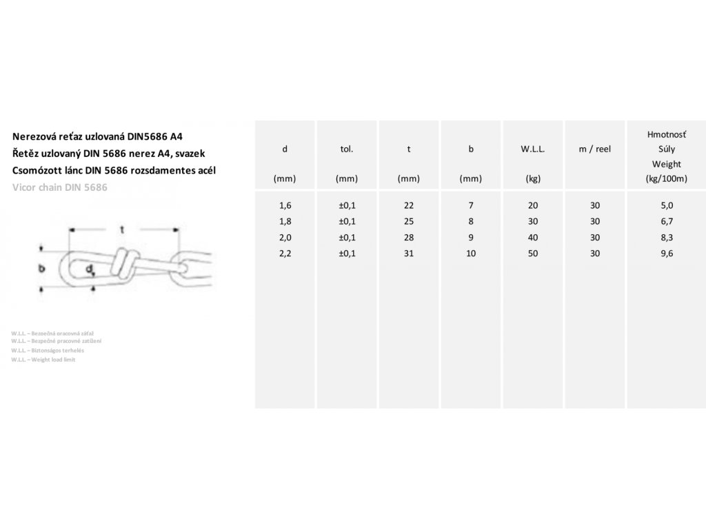 Nerezová oceľ (AISI 316) poskytuje lepšiu odolnosť proti korózii z dôvodu použitia prísad molybdénu, vďaka čomu je reťaz použiteľný aj v náročnejších podmienkach.