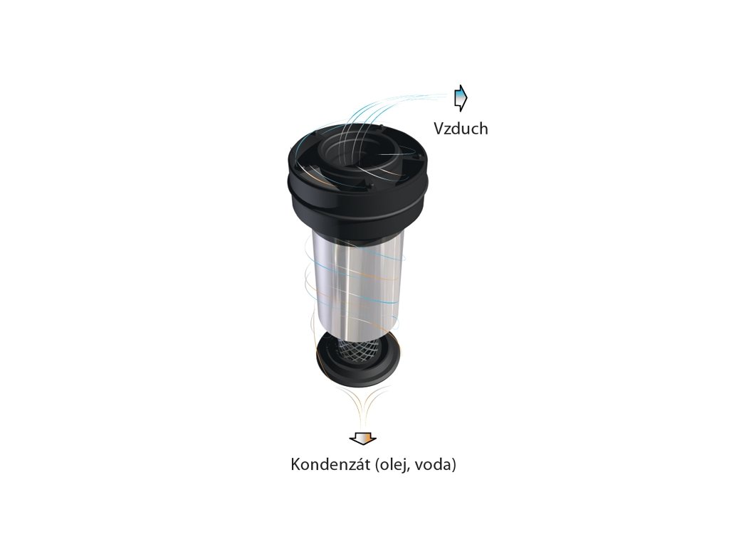 - Odlučovanie kondenzátu (voda, olej) a nečistôt pomocou odstredivého zrýchlenia stlačeného vzduchu
