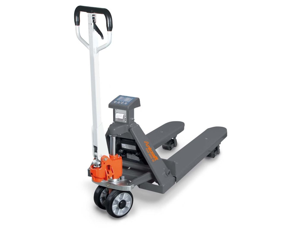Profesionálny paletový vozík so zdvíhacou silou 2 tony a integrovanou elektronickou váhou a tlačiarňou, vhodný ako kontrolná váha na každodenné použitie.