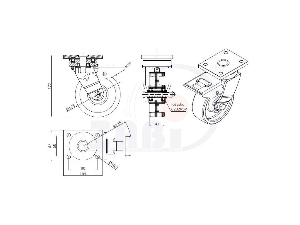 Plastové koleso 125/43 mm, PA6, otočná vidlica s doskou+brzda