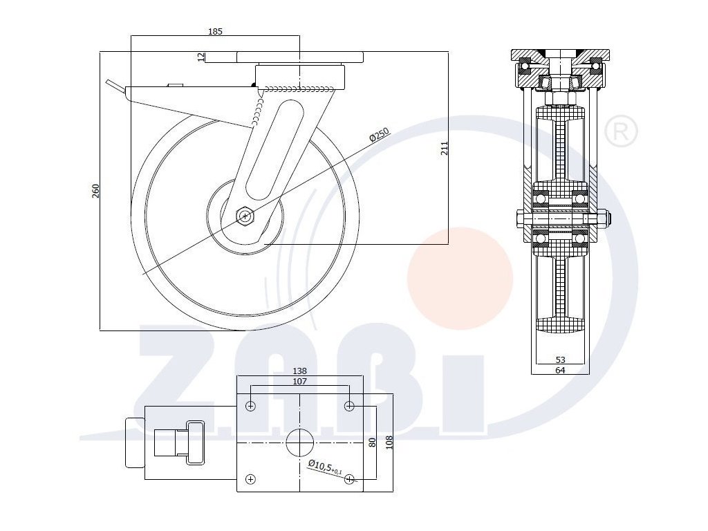 Plastové koleso 250/52 mm, PA6, otočná vidlica s doskou+brzda