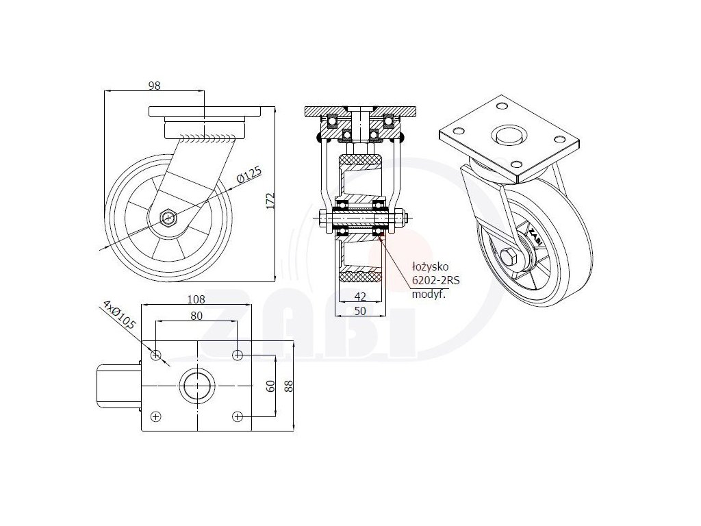 Polyuretánové koleso 125/42 mm, hliník, otočná vidlica s doskou