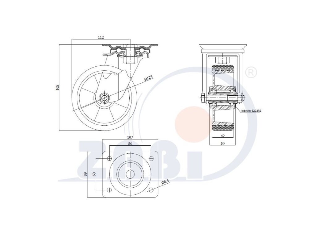 Polyuretánové koleso 125/42 mm, hliník, otočná vidlica s doskou