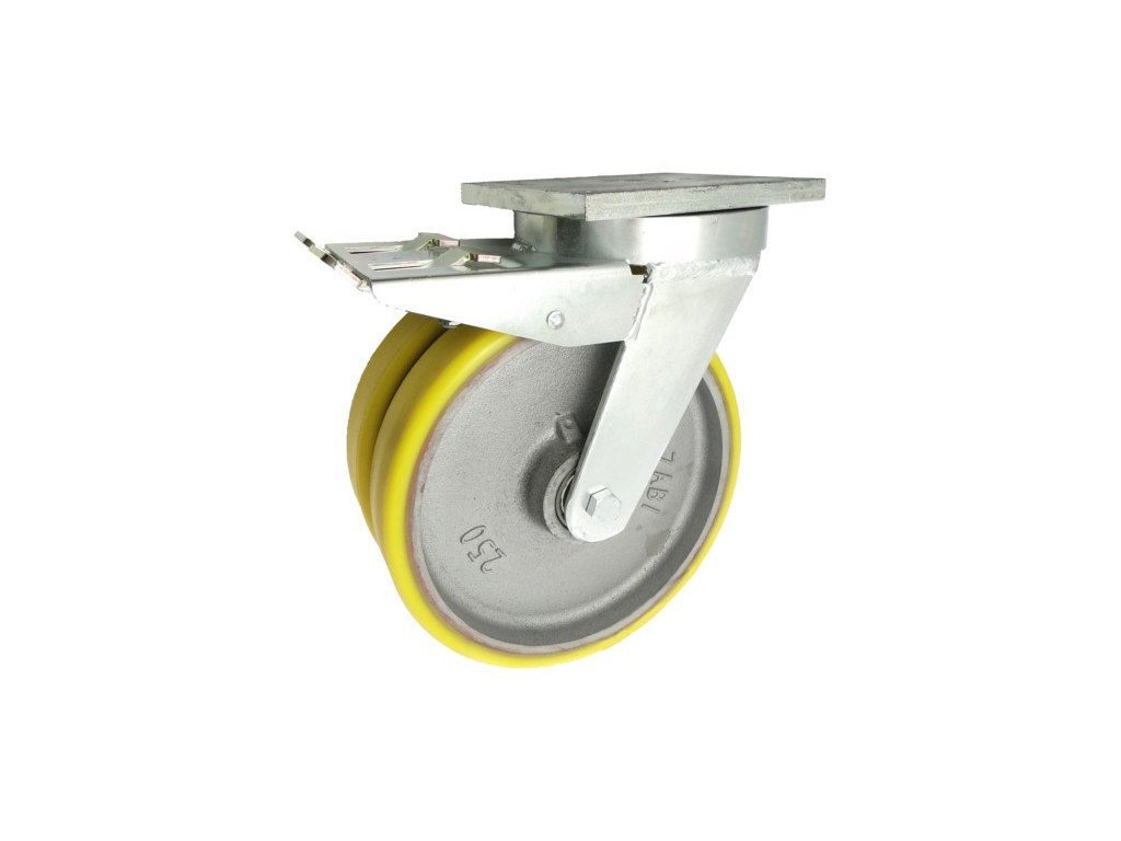 Polyuretánové koleso 250/2x50 mm, liatina, otočná vidlica s doskou+brzda