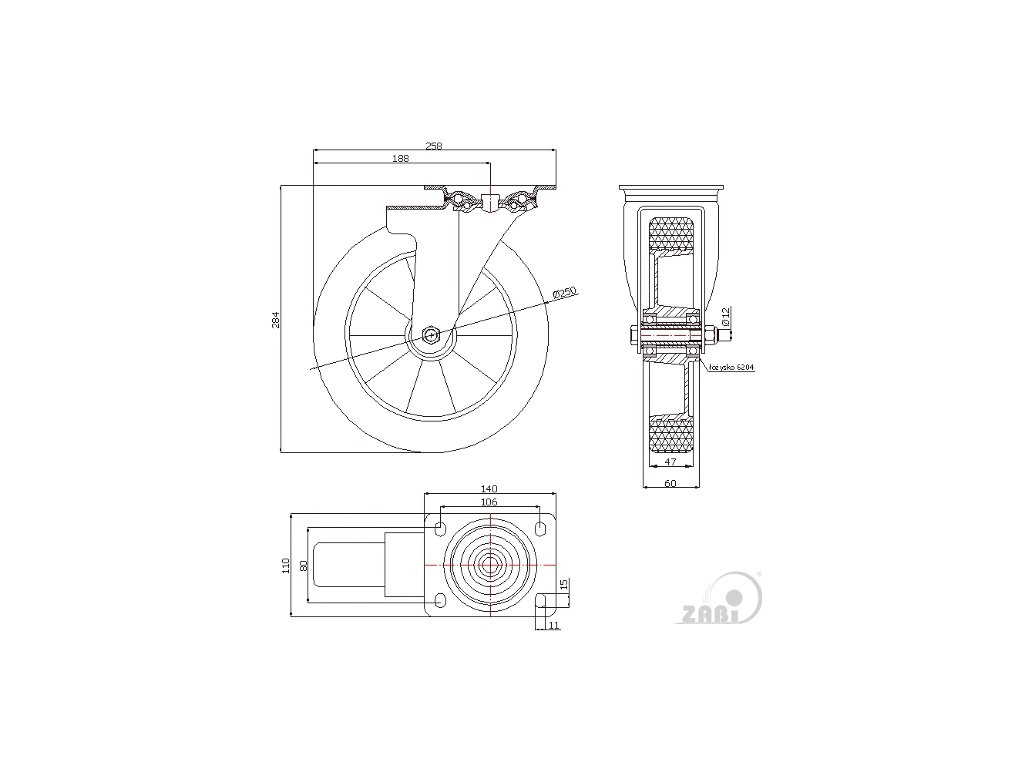 Polyuretánové koleso 250/47 mm, hliník, otočná vidlica s doskou