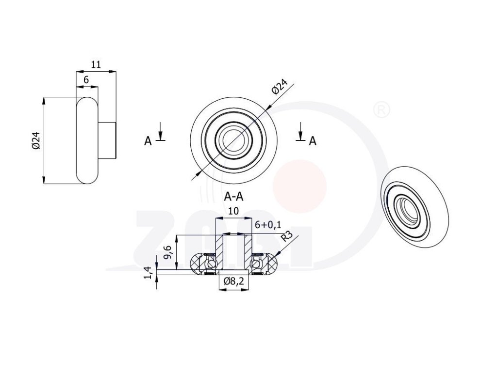 Polyuretánový valček 24/6x6 mm s guľôčkovým ložiskom