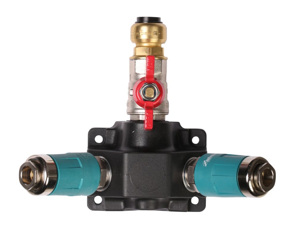 Rozdeľovacia krabica s 2 bezp. rýchlospojkami a guľovým ventilom ø 18 mm