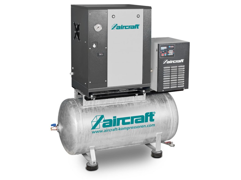 Skrutkový kompresor s výkonom 4 kW s remeňovým pohonom, odhlučnenou skriňou, tlakovou nádobou a kondenzačnou sušičkou, určený pre trvalú prevádzku aj pri nižšej spotrebe vzduchu.