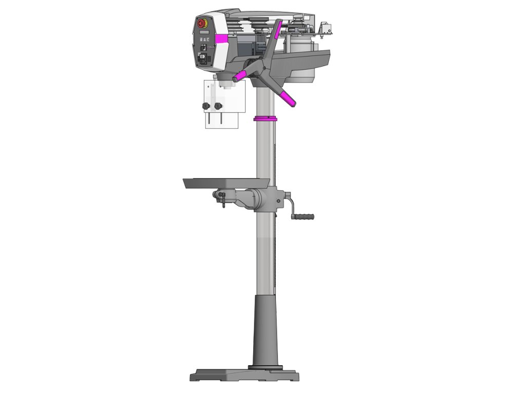 Stĺpová vŕtačka s remeňovým pohonom a moderným dizajnom.