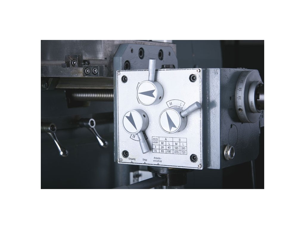- Posuv pinoly pomocou troch pákových rukovätí (vŕtanie) alebo pomocou ručného kolesa jemného posuvu,