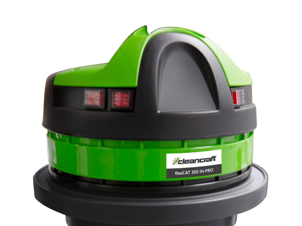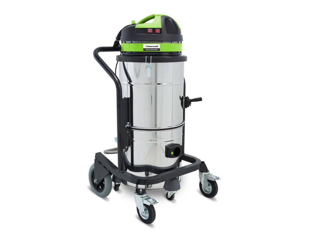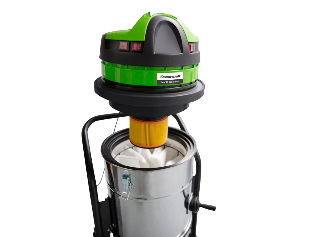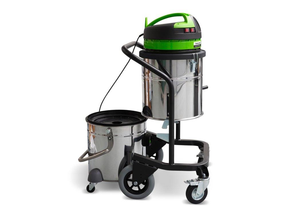 Priemyselný vysávač s vysokým výkonom, tromi motormi a ručným oklepom filtra.